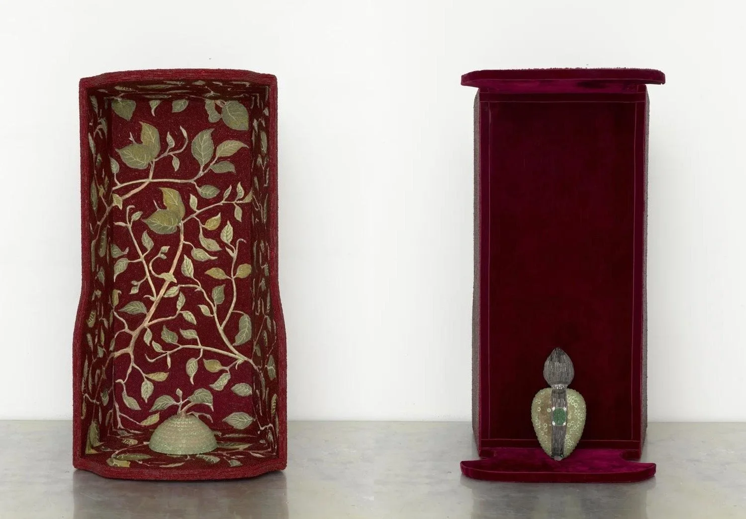 The primary organ of life and vitality, the heart pulsates in a layered rhythm over the constant tempo of breath. Everpresent, even newborns demonstrate an understanding of rhythm, perhaps developing this sense while in the womb via the beat of the mother’s heart and the pace of her step. Esperanza Cortés’s Embroidered Allegories series celebrates forces of life with a particular reverence for matriarchal power and its fiercely protective yet benevolent role in nurturing corporeal, ecological, and spiritual life. The artist began this series of paintings and sculptures over ten years ago after an injury from a bus accident halted her career as an Afro-Latin dance instructor. In the wake of this loss, Cortés began deconstructing her dance costumes and incorporating their elements, such as ornate beading and embroidery, into her work, repurposing these parts with found materials including vintage pressed glass, crystals, beads, chains, amulets, pearls, and military fringe to name a few. The artist’s dance background manifests in the intricate patterns prevalent in her oeuvre, passionately vibrant palettes, and gestures of dangling chains that break out of the confines of their canvas structures. The body of work vibrates with a resonant, intricate cadence, composed of soft notes of delicate, radiating flora imagery flourishing across the surfaces and hard thumps of tough tones reverberating from leather, chain, glass, and metal parts embedded in the works. Just as the beat of the heart keeps time, Cortés's works also hold time—from the laborious hours that the artist spends creating them to the layered lives of the found materials and their relationships to those connected to them before her. The intricacy of the work reflects not only mosaics of lived experience, people and materials interconnected, but also the complicated circuits of consumption that the materials travel through over time.