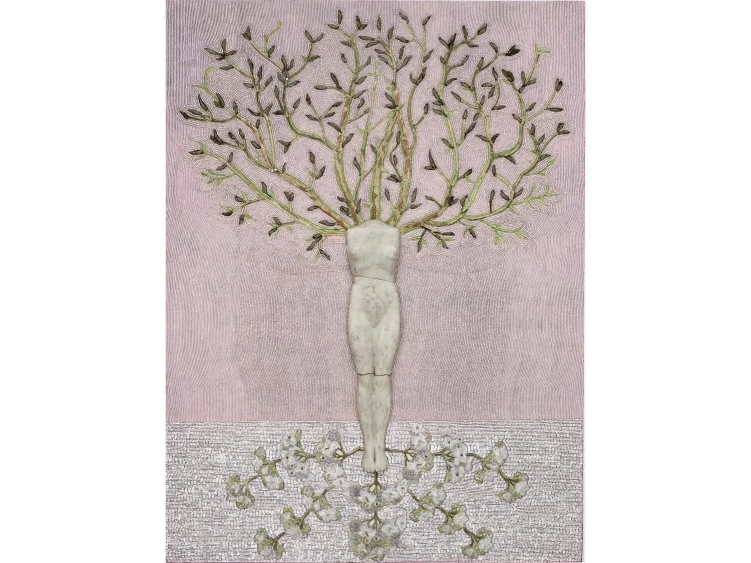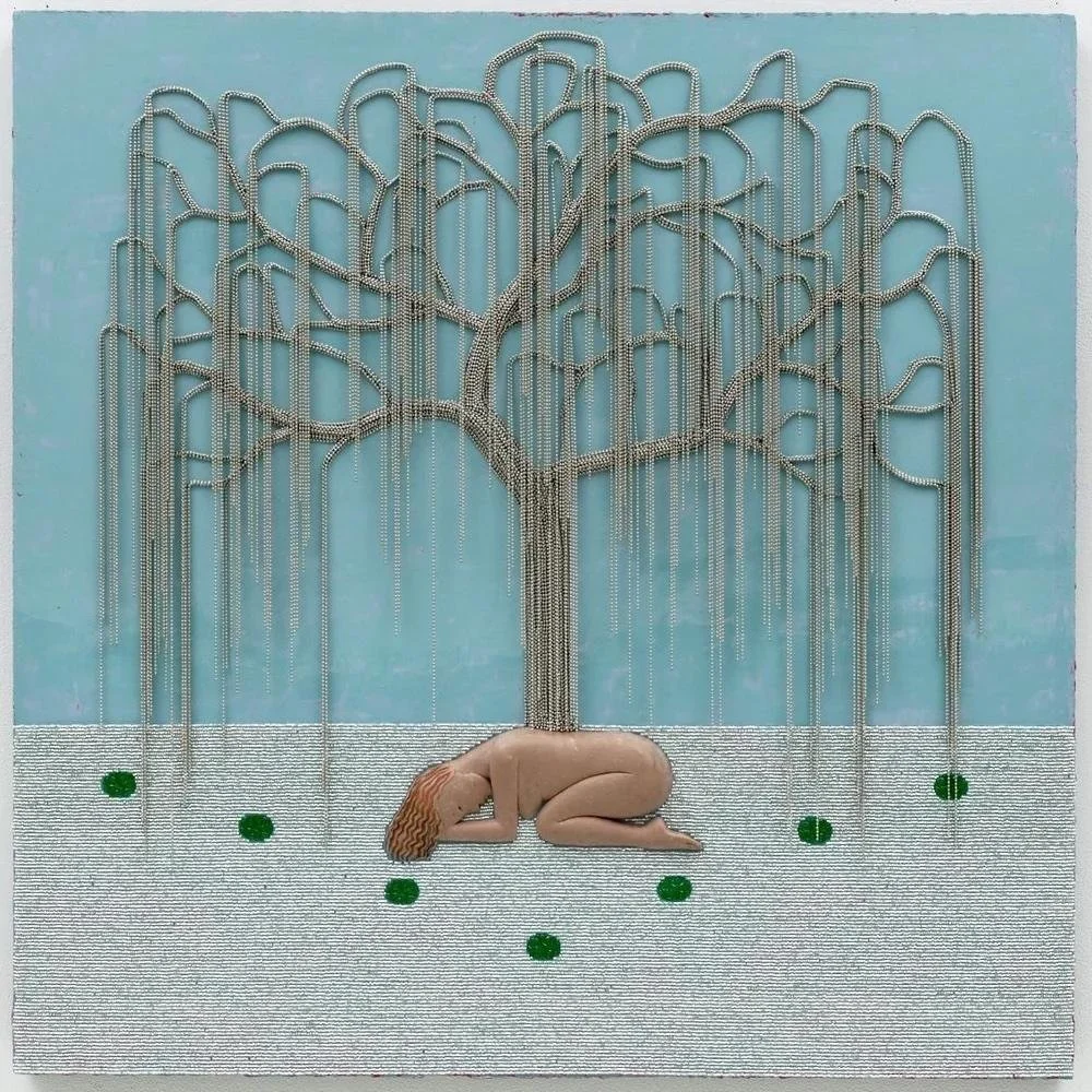 Weeping Willow, 2024, clay sculpture, crystal beads vintage pressed glass, acrylic on wood, 36 x 36 x 5”