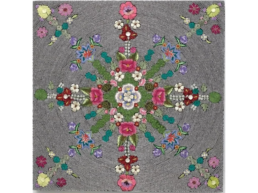 Metamorphosis, 2024, personal embroidery, crystal beads, glass beads, crystals, acrylic on wooden panel, 24 x 24”
